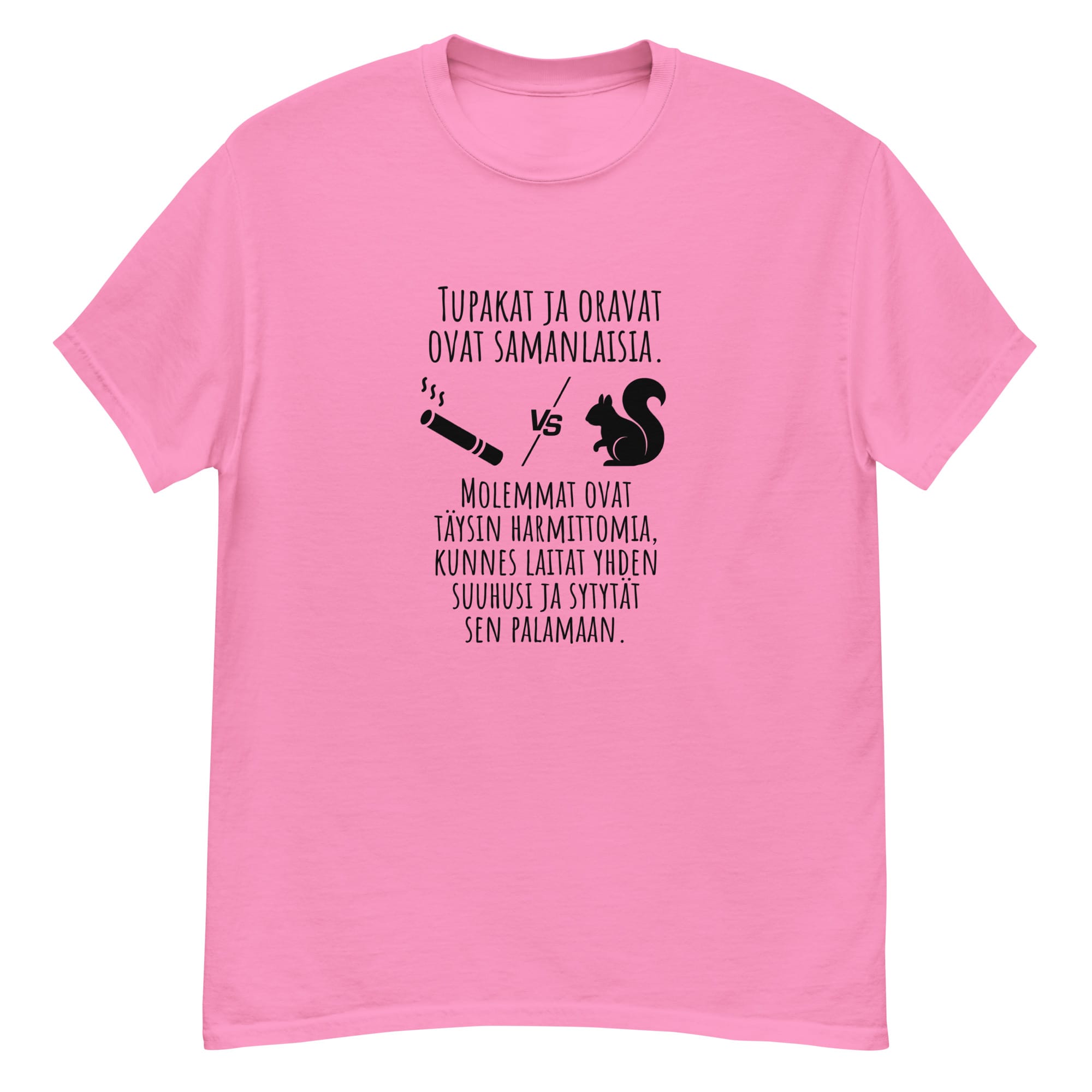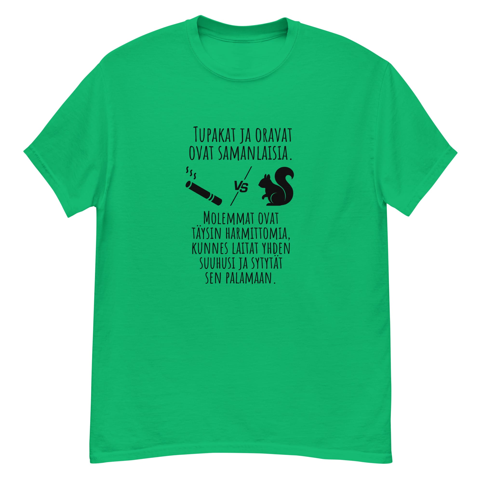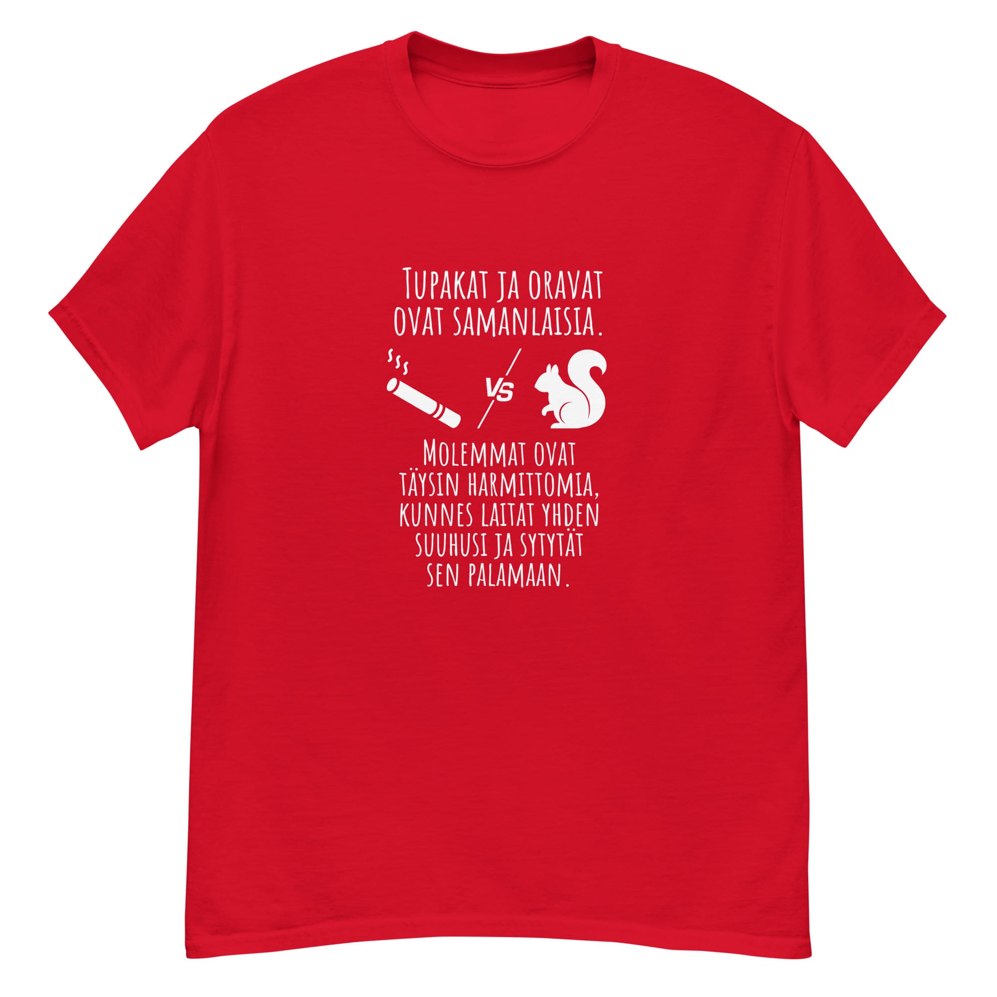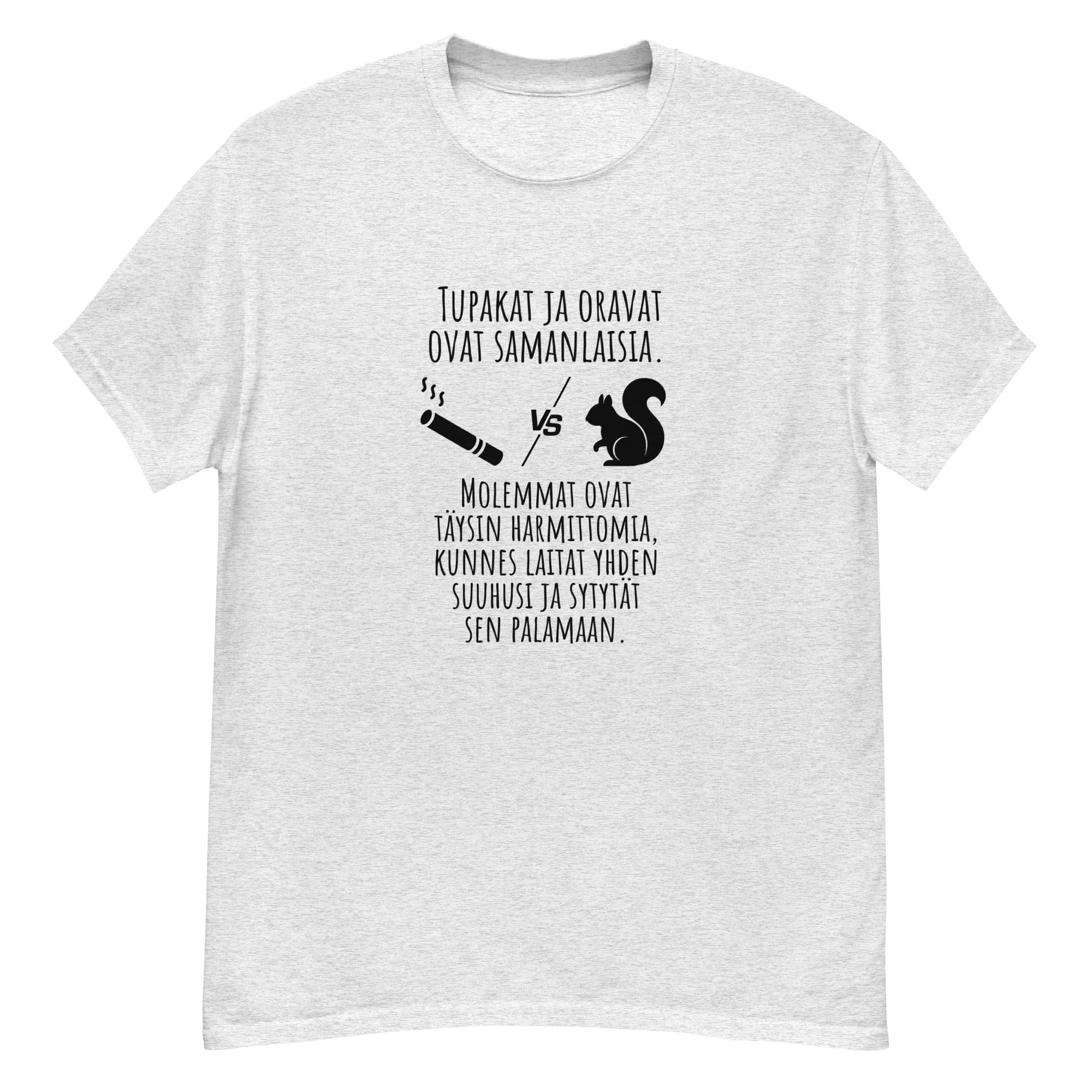 “Tupakat ja oravat ovat samanlaisia…” – tämän terävän humoristisen paidan lause herättää uteliaisuutta ja naurua jo ennen kuin loput sanat on edes sanottu. Vihjaileva aloitus tekee siitä loistavan keskustelunavauksen ja antaa oivaltajalle palkinnon: naurun.